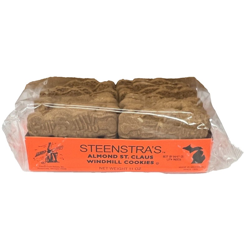 Indulge in the delicious taste of Steenstra Almond St Claus Windmill Cookies. These cookies are perfect for any occasion, whether it's a quick snack or a sweet treat to share with friends and family. This package contains approximately 20 cookies. Please note that these cookies contain tree nuts and wheat, so they are not suitable for individuals with allergies. The cookies are made in Michigan and are a great addition to any pantry. Enjoy the taste of Steenstra Almond St Claus Windmill Cookies today!