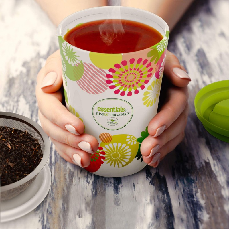 The Essentials by Kiss Me Organics Steep & Strain Ceramic Mug with tea infuser is perfect for brewing single cups of loose leaf tea. This cup features a thermo double wall design to keep your tea hot and your hands comfortable. It comes with a stainless steel tea strainer with ultra fine holes to keep the leaves out of your tea, a ceramic lid to keep your tea warm while steeping, and a silicone lid for taking your cup on the go! This convenient, easy-to-clean design is available in 5 gorgeous patterns.