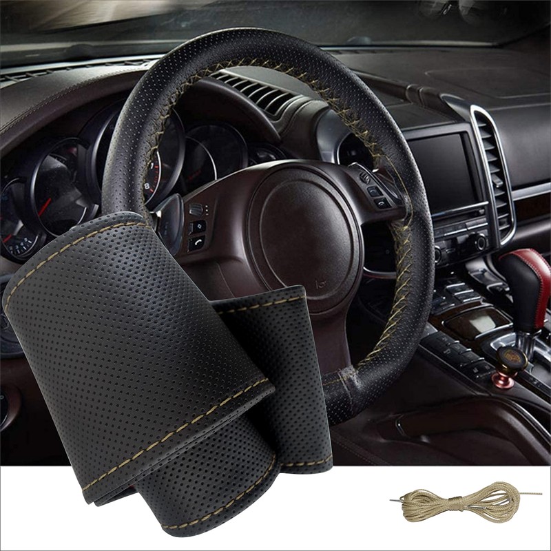 Steering Wheel Cover PU Leather Car Steering Wheel Cover for Lacing Sewing with Needle and Thread Polka Dot Universal Size 37-39 cm M2 Black Beige Stitching