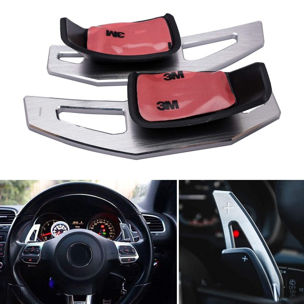 This listing is for 1 set ( - and +) aluminum alloy steering wheel gear shift paddles extension, specially for selected Volkswagen steering wheel. **Fitment:** VW Golf6/R/GTI VW Tiguan Rline VW Eos/all model VW Polo (6R)/GTI VW Scirocco/all model VW Jetta MK5/2.0T/Sportline VW Golf MK5 Variant/Sportline VW Golf Touran(1T2)/Highline VW Passat (3C)/V6 4 MOTION VW Golf MK5/R32/GTX/GTI/GT-TSI VW Passat Variant(3C)R36/V6 4 MOTION/Sportline Reference Paddle Part Number:5K0951528,5K0951527 Golf MK6 Highline,Golf MK6 Variant Sportline,Pasat CC/all model For installation, clean the surface you apply to, simply peel the double side tape and apply it . It will give your Volkswagen an elegant luxury looks with no modification needed. **Features:** One piece of metal silver aluminum steering wheel shift paddles extension Fits Volkswagen car listed above Easy Installation, Simply peel and apply, No modification needed Size: 4.7" x 1.57"