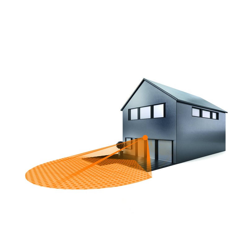 • The wall sensor with 130° detection angle and max. 12 m range covers a detection area of up to 150 sqm and can be used both indoors and outdoors