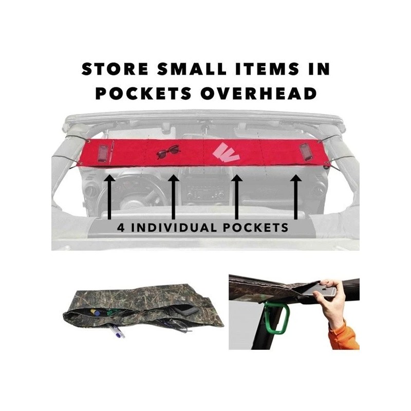 Overhead Pocket Kit (J0045850) by Steinjager®. Color: Black. This pocket will work with any top, stock or aftermarket. It is a good place to keep your phone, small tools or anything else you want to keep from falling out of your Jeep. It is held in between the roll bar with the use of bungee balls and the openings completely close with the use of hook and loop material.