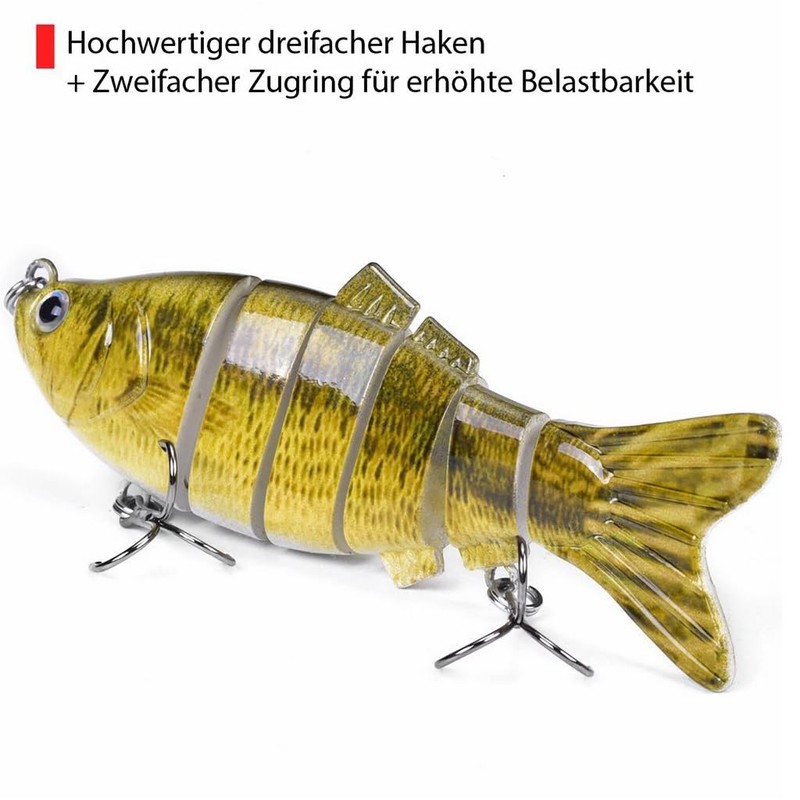Lifelike fishing lure - Equipped with realistic looking 3D eyes and a pearl powder coating, this stone fishing lure brilliantly reproduces bright, sharp colours and patterns of real bait fish. Built-in steel balls - the built-in rattle inside the bait helps to adjust the centre of gravity. It can extend the casting distance, and even the beginner can easily control the bait and achieve more prey. Sharp hooks - The swimbait body is equipped with two rust-proof treble hooks on the outside, high durability and flexibility, suitable for fresh and salt water, hook size is appropriate and they are also quite sharp. Multi-joint body - Made of a robust ABS plastic and six segmented body sections, the wobbler floats a natural S-shaped swimming action at any speed and provides an incredibly flexible bend to provide additional action to actively attract the target fish to chase it. It floats in the water when not in motion, and floats and dives down quickly when quickly retrieved. Versatile types of fishing for predatory fish such as perch, zander, pike, trout, etc. It is perfect for deep sea boat fishing, deep sea rock fishing, sea beach fishing. Package contains three wobblers in a matching bait box