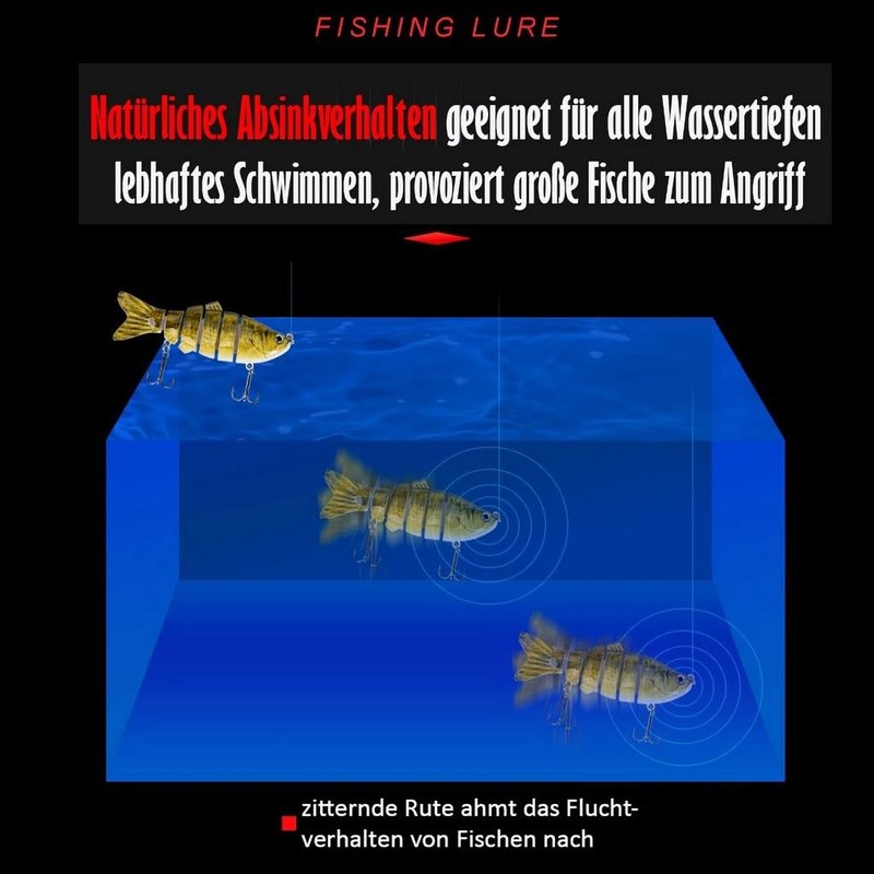 • Multi-joint body - Made of a robust ABS plastic and six segmented body sections, the wobbler floats a natural S-shaped swimming action at any speed and provides an incredibly flexible bend to provide additional action to actively attract the target fish to chase it. It floats in the water when not in motion, and floats and dives down quickly when quickly retrieved.