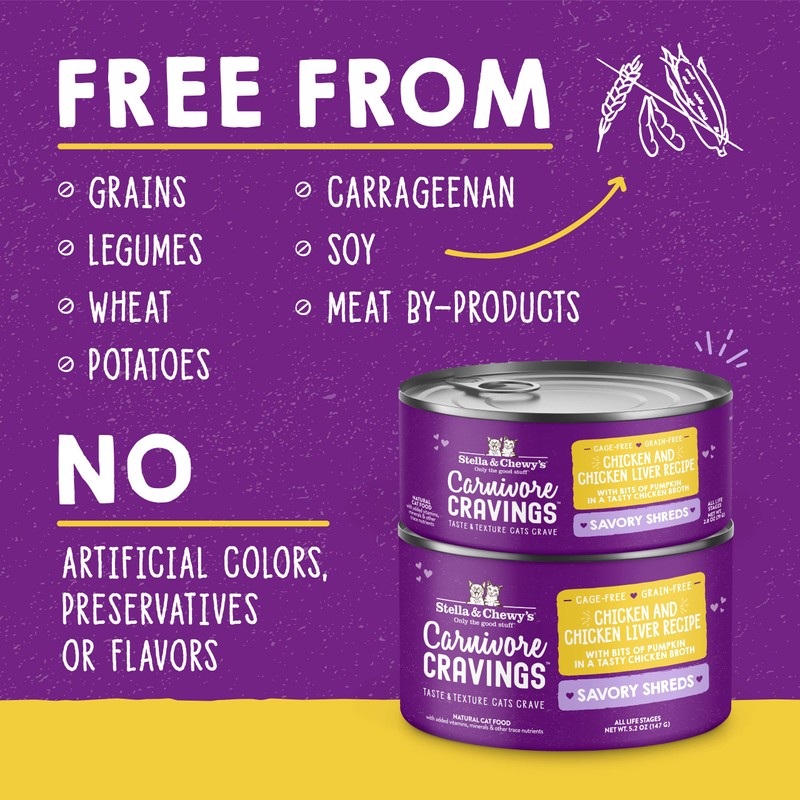 Stella & Chewy’s Carnivore Cravings Savory Shreds Cans – Grain Free, Protein Rich Wet Cat Food – Cage-Free Chicken & Chicken Liver Recipe – (2.8 Ounce Cans, Case of 12)