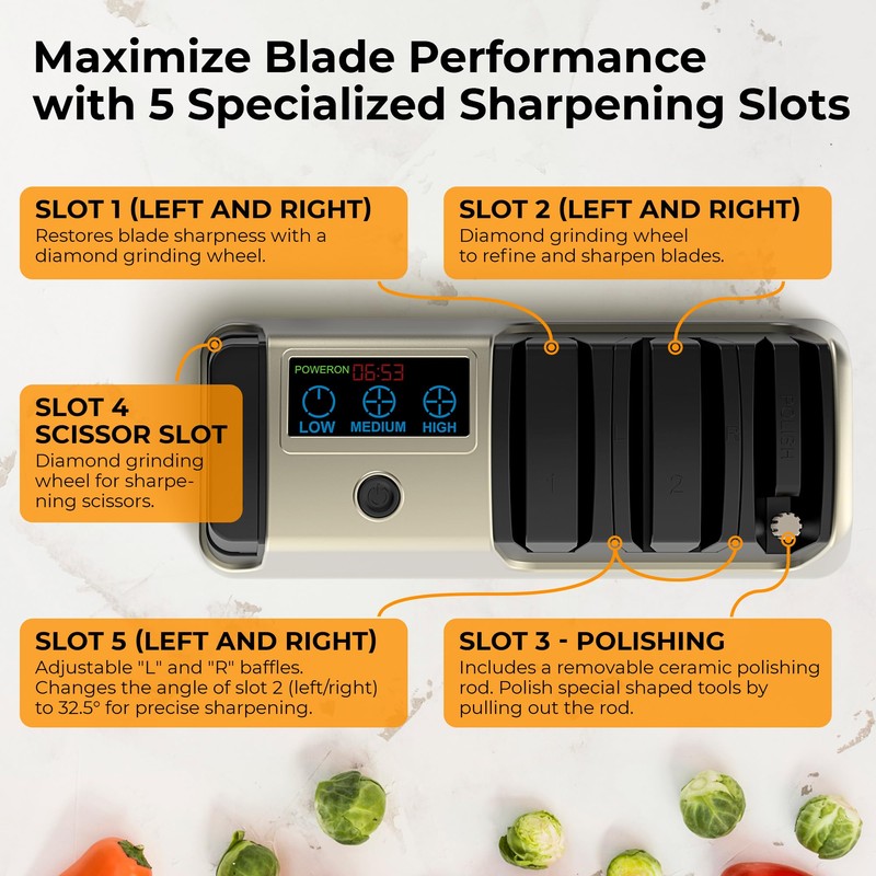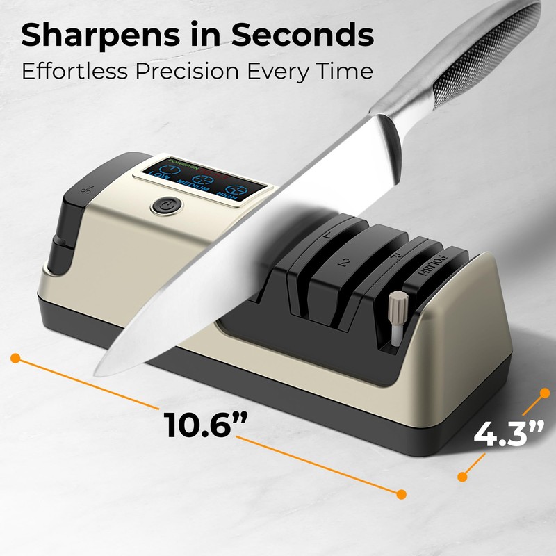 - LCD DISPLAY ADJUSTABLE SPEED CONTROL - Customize the sharpening speed to suit different blade types and sharpening needs. This electric knife sharpener has LCD display that lets track speed settings and monitor sharpening progress. Professional-grade results with each use.