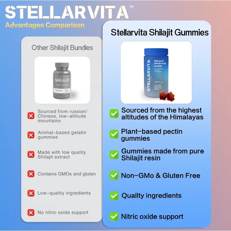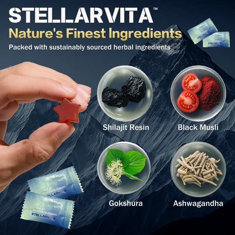 Stellarvita Shilajit Prostate Guard Gummies are powerful, plant-based supplements designed to support nightly hormone balance, prostate health, urinary flow, and liver detox. Each gummy delivers a potent 4000mg blend of Shilajit, Linden Extract, Lycopene, and Ashwagandha—ingredients known for their mineral-rich, antioxidant, and adaptogenic properties. This formula promotes hormonal wellness, reduces inflammation, and supports natural detoxification processes. With 60 easy-to-take gummies per bottle, it's a convenient and tasty way to nourish your body without pills or powders. Ideal for men looking to maintain vitality, stamina, and overall well-being, Stellarvita combines traditional wellness with modern convenience.