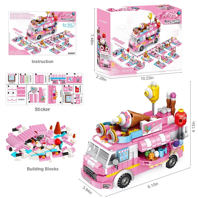- 553Pcs FANTASTIC ICE-CREAM TRUCK TOY: This colorful ice-cream van is great for play and display. Little builders can drive the ice cream truck, serve ice-cream cones, popsicles and drinks from the serving hatch. The big ice cream on the top of the truck can move up and down, making our ice cream truck more eye-catching in the city! This Ice Cream Truck Set will keep kids entertained for hours as they tackle the build then explore all the details.