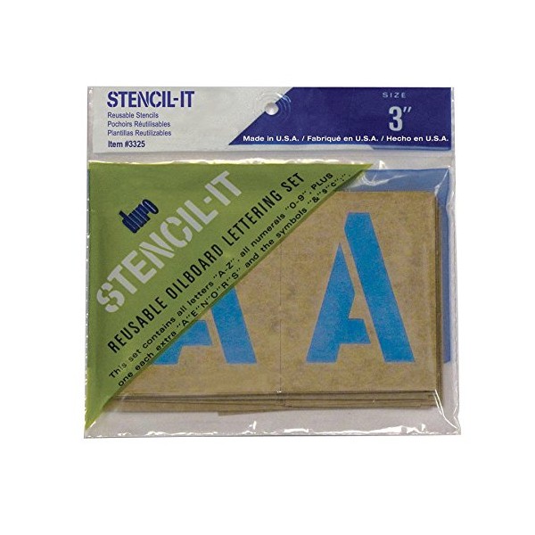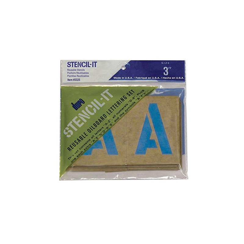 Duro Stencil-It sets are made of sturdy oil board, a long lasting material fused with drying oils to resists bleed-through and provides sharp clean edges that resist fuzzing even after repeated use. This 3-Inch set contains all capital letters: A thru Z, all numerals: 0 thru 9, plus one extra letter of each: A, E, O, N, R and S. The set contains the symbols: &, $ and cent sign and the symbols to create a colon, semi-colon, dash, comma and period.