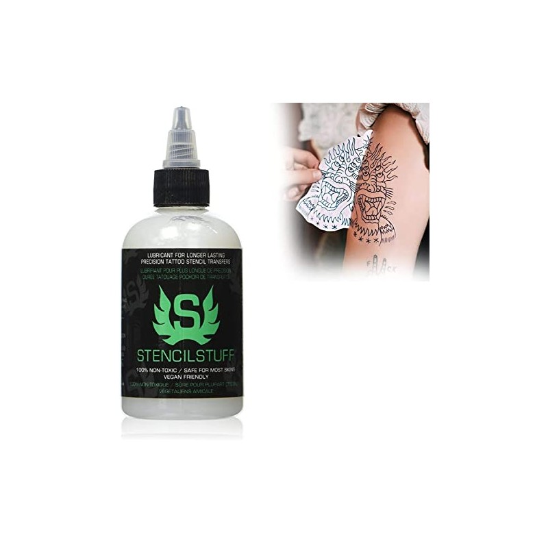 Stencil Stuff was developed in 2005 by professional tattoo artists who knew there had to be a better way to apply detailed and precise stencils and get more durable stencil artwork. Stencil Stuff is a creamy lotion that has been formulated and laboratory tested to be non-toxic and safe for most skins.Stencil Stuff makes the transfer cleaner, cleaner and sharper than using other traditional methods and eliminates the possibility of cross-contamination. Stencil Stuff eliminates the need for bloodline or gray line. It also works exceptionally well if a contour is needed or desired. Stencils have become a necessity in the tattoo industry, used daily by thousands of professional tattoo artists. If it is necessary to remove the transfer stencil to reposition, it can be removed with alcohol. The original thermal copy stencil can be reapplied several times without fear of using damaged stencils or having to make another one. Stencil Stuff Lotion Squezz Bottle Element Tattoo Supply (4 oz) by Element Tattoo Supply Sharper, Cleaner, Sharper Transfers Reapply stencil images as many times as needed No contour or blood line required No cross contamination - Worry-free! Lab tested, safe and non-toxic!