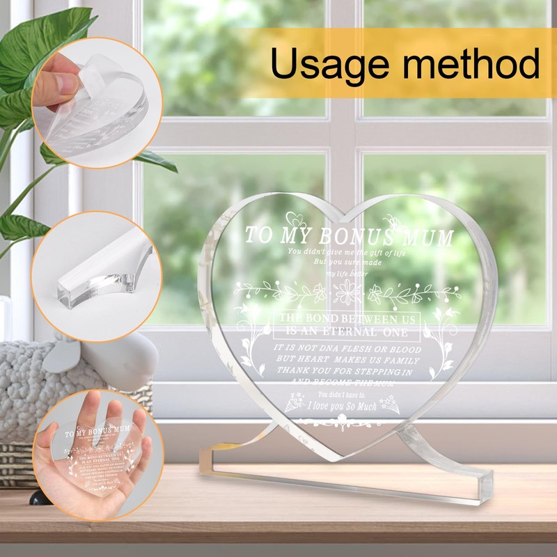 - Gifts for Mother in Law: You will receive a beautiful clear heart shaped acrylic ornament and an acrylic base, the heart shape signifies love and care, with heartfelt wishes printed on it, ‘You didn't give me the gift of life, but you sure made my life better. The bond between us is an eternal one’, especially suitable as a Step Mum Gifts to express deep respect and love for her.