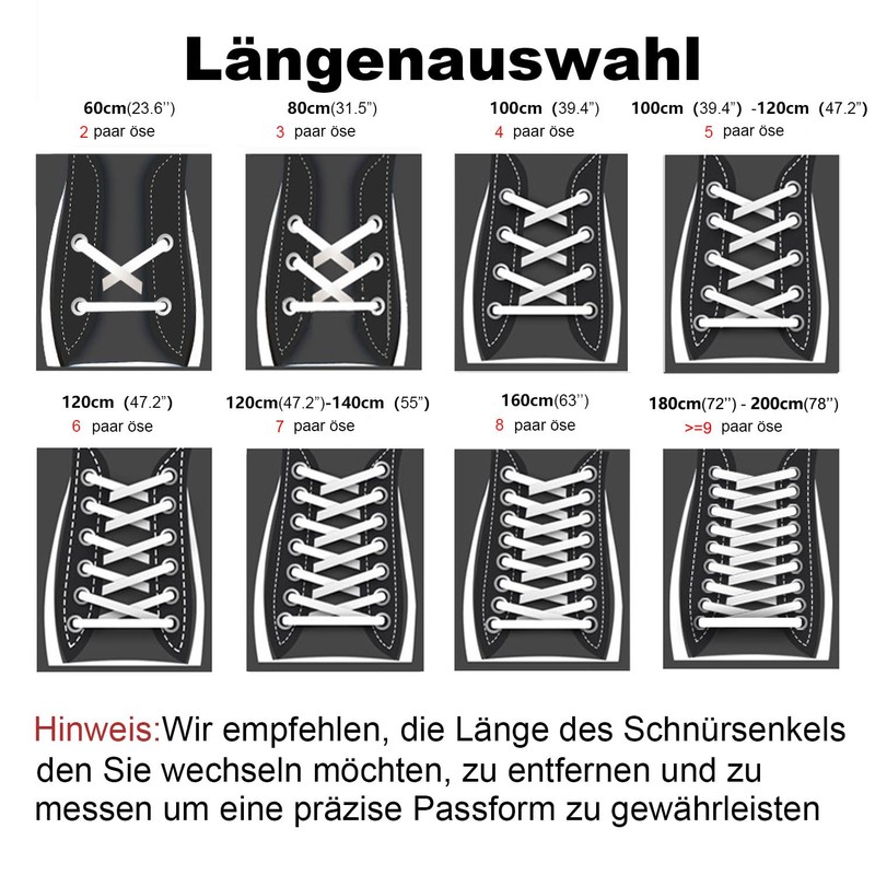 - Large selection for size and colour – we offer 26 colours flat laces in 10 lengths: 60 cm (24 inches) / 80 cm (32 inches) / 100 cm (39 inches) / 120 cm (47 inches) / 130 cm (51 inches) / 140 cm (55 inches) / 150 cm (59 inches) / 160 cm (63 inches) / 180 cm (71 inches) / cm(79in), It is better to measure your existing one to find the best length