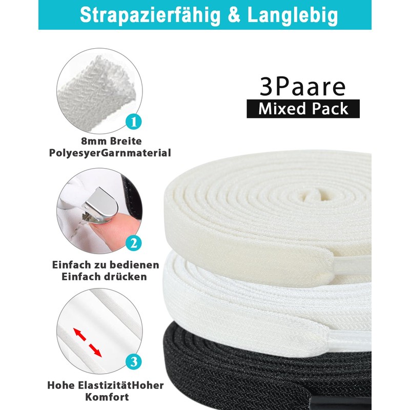 - Praktische Verpackung: 3 Paar Schnürsenkel (6 Schuhbänder) und 12 Metallclips. Nicht nur Weiß und Schwarz, sondern auch einige bunte Schnürsenkelkombinationen, um Ihren Bedürfnissen gerecht zu werden.