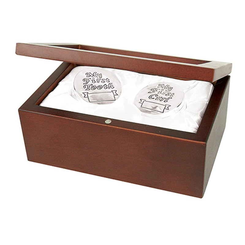 - Set includes two handsomely engraved round boxes, one for first tooth and one for first curl