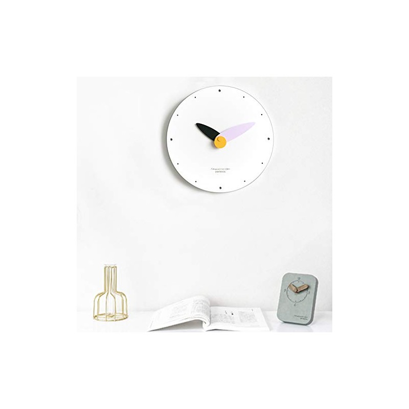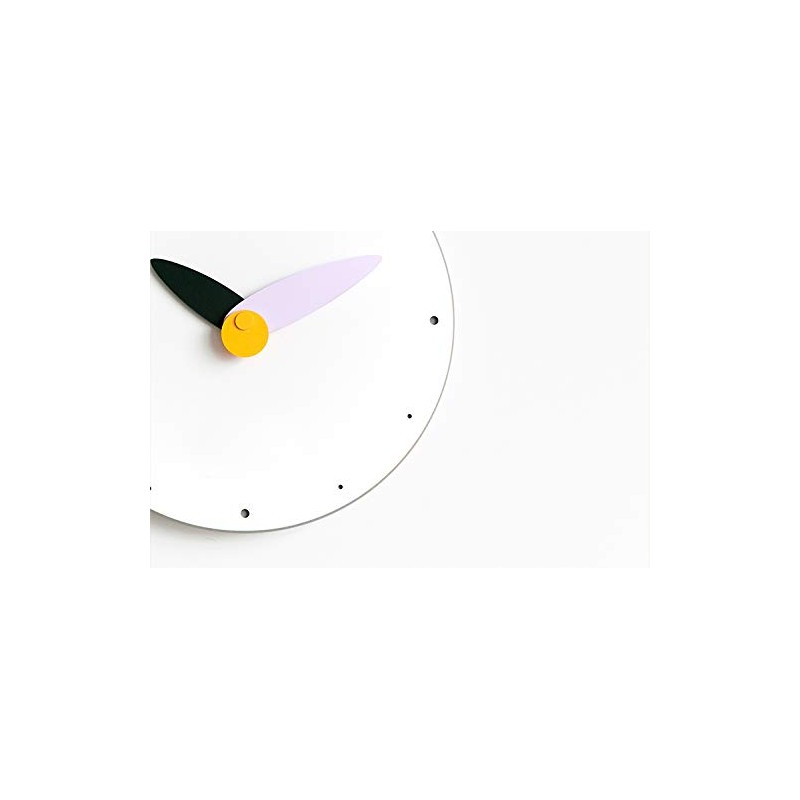 This clocks measures 11.5”X 11.5” and features a white FORESCOLOR* ecoboard with veneer dial that is 0.2” thick. The clock hands are made of purple and black polished acrylic, both of which are covered with a pineapple yellow circular disk. Operates with 1 AA battery which is not included.