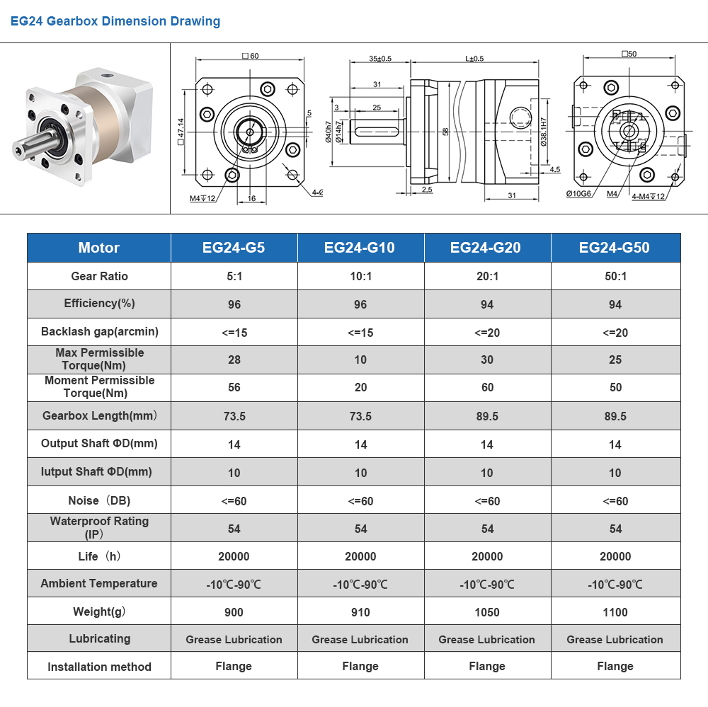 The size of this gearbox is 60 x 60mm and the input shaft diameter is 10mm. This high-precision planetary gearbox is belong to EG series gearbox, it with gear ratio 10:1 and a maximum 15arc-min backlash. It's an excellent choice for applications that require good accuracy and reliability at an exceptional value. This inline planetary gearbox built-in an input shaft coupling which can match any standard Nema 24 stepper motor and brushless dc motor.