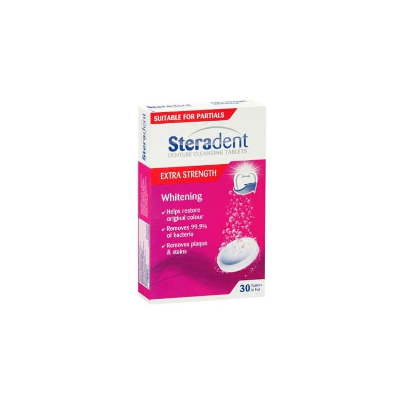 – The consumption of red wine, tea or coffee can lead to discolouration and stains. Steradent Extra Strength Whitening tablets are formulated to safely remove these stains and ensure your dentures stay brilliantly clean and stain free.