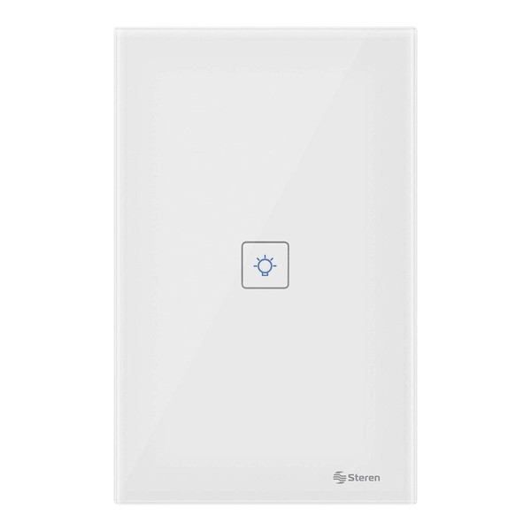 ¡Convierte tu casa en una Smart Home! Con este apagador touch Wifi* sencillo, tendrás iluminación inteligente para controlar y programar, con tu celular o voz, el encendido o apagado, en donde quiera que estés. Se adapta a cualquier chalupa estándar, y puedes encenderlo y apagarlo manualmente con su interruptor touch, como cualquier apagador normal. Se controla por medio de nuestra app Steren Home, desde donde puedes crear horarios de encendido/apagado y rutinas, compartir el control con otros usuarios y mucho más. Es compatible con los asistentes Alexa* * y Google* Assistant* * que te dan comodidad de uso dentro de tu hogar, al activar o desactivar el apagador con tu voz. Conexión Wi-Fi Función de “timer” desde la app Comparte el control con otro usuario Funcionamiento manual Compatible con Alexa y Google Assistant App: Steren Home Voltaje de operación: 110 a 240 Vca (50/60 Hz) 10 A máx. Carga máxima: 700 W Consumo en espera: 0,1W/h Frecuencia Wi-Fi: 2,4GHz Estándar: IEEE 802.11 b/g/n