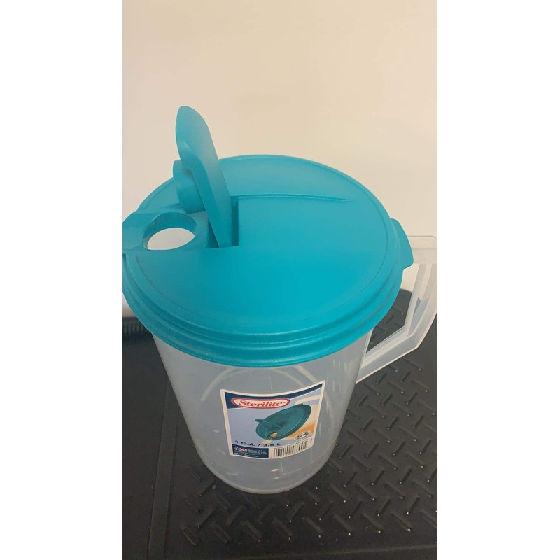 This Sterilite 1-Gallon Round Pitcher is a great addition to your kitchen.It stores and serves your drinks in a stylish fashion with its clear compartment and blue lid. It features a hinged, flip-top spout that stays open and out of the way when you pour and has comfort grip handles for a pleasant pouring experience. This pitcher features graduated measuring marks that make it easy to mix drinks inside of it and is durable to last you many years.Sterilite brings you versatility and durability all in one and it will surely be your go-to pitcher.This package contains 6 pitchers.