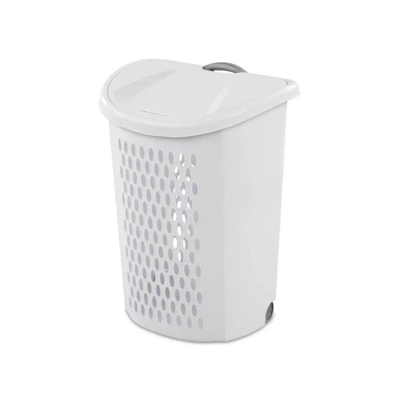 Features. Smooth gliding wheels. Retractable pull handle. Integrated handles on each side. FlipTop Lid. The ultra wheeled hamper offers smooth gliding wheels and a retractable handle. That pulls out to easily transport clothes to and from the laundry room. The lid helps to keep contents concealed and the hole pattern allows clothes to remain ventilatedSpecifications. Color White. Size 2838