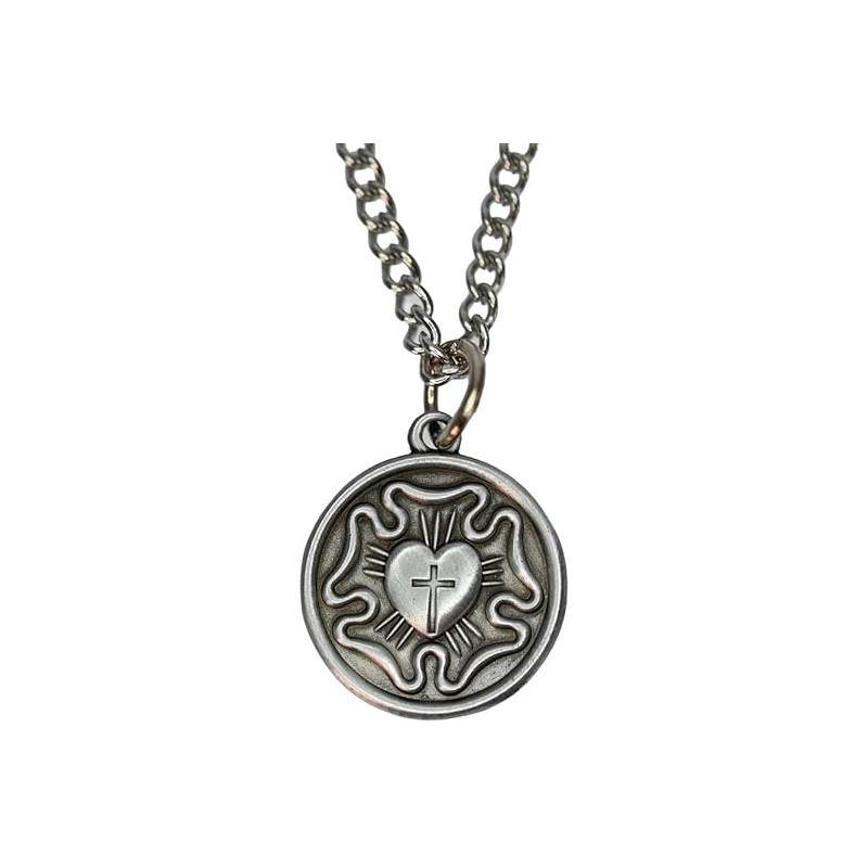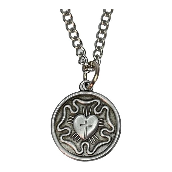 - The Lutheran Rose Necklace features a beautifully crafted pewter Luther Rose pendant, measuring 3/4 inch in diameter, elegantly suspended on an 18-inch stainless steel fine curb chai