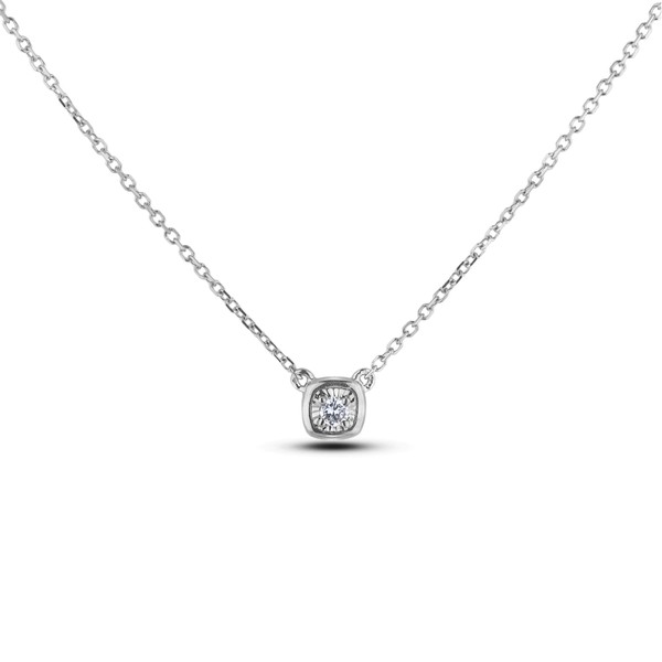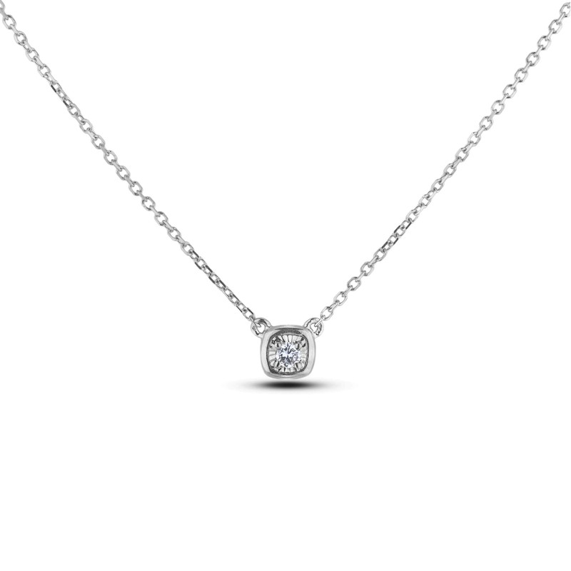 - ILLUSION-SET DIAMOND NECKLACE Simple yet dainty, this dazzling diamond pendant is tailored to fit into your minimalist style. Fashioned in sleek sterling silver, set with a 0.04 Ct Canadian diamond solitaire is featured inside of a cushion-shaped pendant-- enhancing size and sparkle at its centre. Polished to a bright shine, this look suspends along an 18" rolo chain with an adjustment ring at 16" secures a spring-ring clasp.