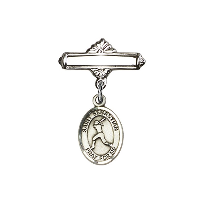 Sterling Silver Baby Badge with St. Sebastian/Softball Charm and Polished Badge Pin 1 X 5/8 inches