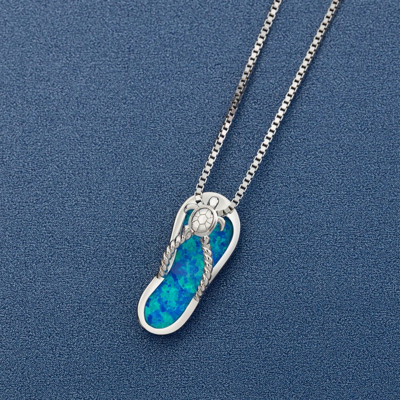 Sterling Silver Created Blue Opal Turtle Flip Flop Slipper Necklace Pendant with 18" Box Chain