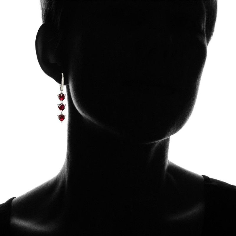 - Sterling silver earrings showcase three dangling heart shaped created red ruby gemstones accented by white topaz stones.
