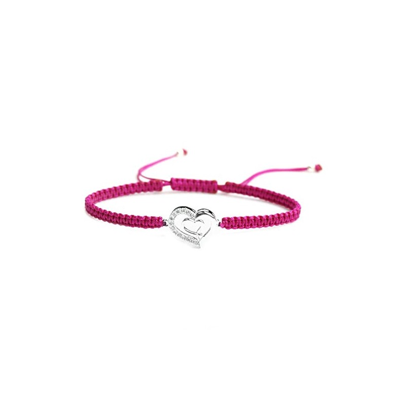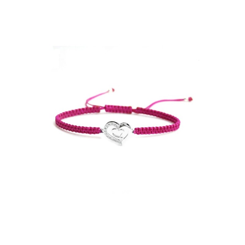 Sterling Silver Cubic Zirconia Double Heart Love Rose Pink Hand-Braided Cord Adjustable Bracelet