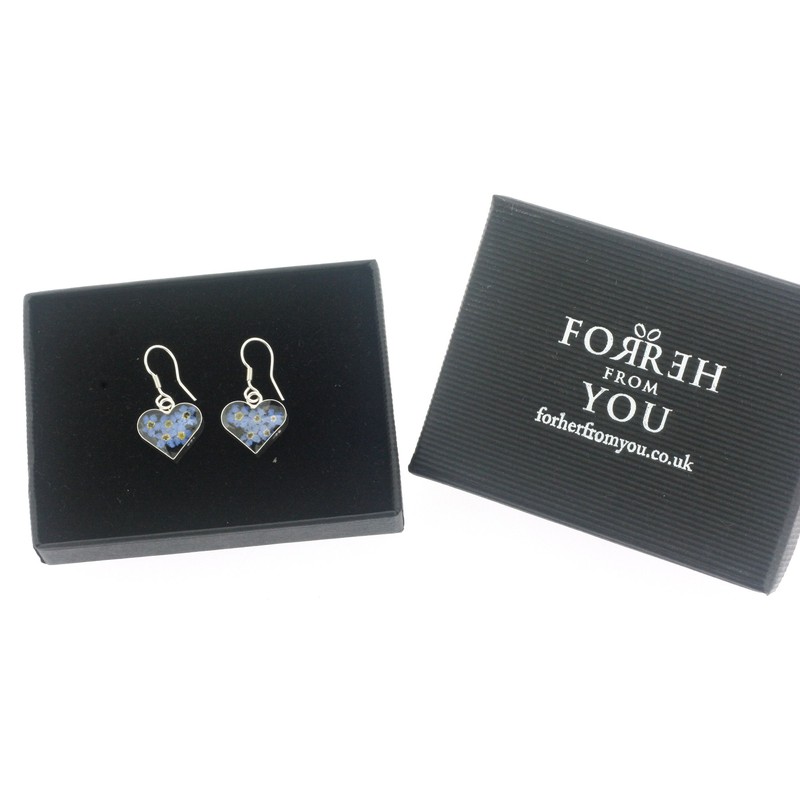 Sterling Silver Heart Drop Earrings Made With Real Forget Me Nots