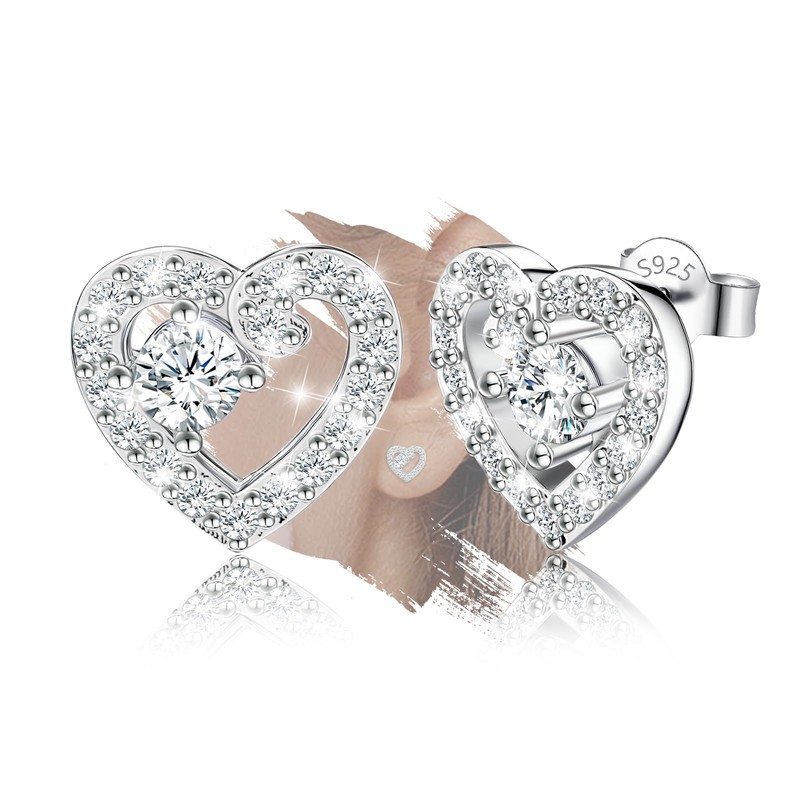 - This pair of sterling silver heart-shaped stud earrings creates a three-dimensional sheen that catches light from every angle with a sparkling cubic zirconia inside the heart, symbolizing how true love reveals new aspects over time.