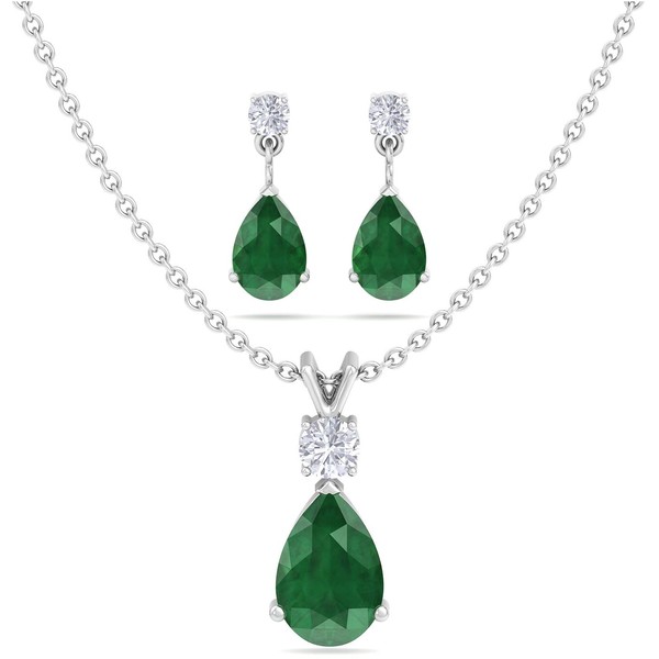 Sterling Silver Jewelry Set for Women Pear shaped 7x5mm Emerald and 3mm Natural White Topaz Pendant Necklace and Matching Pear Shaped Emerald & White Topaz Stud Earrings