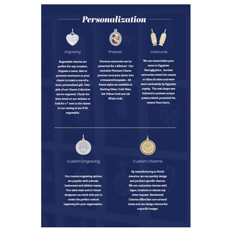 Our charms are the classic collectibles that never go out of style. No other jewelry captures a moment as perfectly as a fashionable charm. Charm bracelets are often passed down as keepsakes for loved ones to cherish for generations. Over 40% of our charm collection can be engraved. Today's charms are tomorrows's heirlooms.