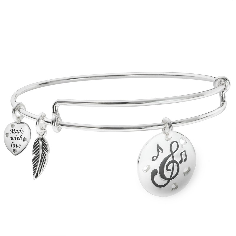 Sterling Silver Love Music Heart Feather Dangle Charm Expandable Bangle Bracelet