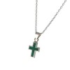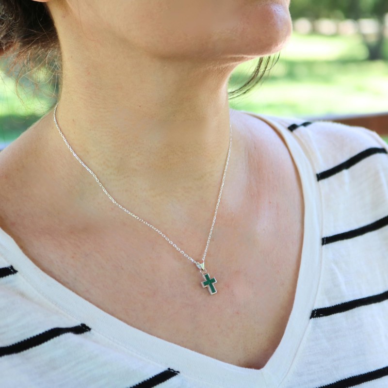 Sterling Silver Mini Green Cross Pendant Necklace - Handmade Minimalist Malachite Cross with 16+2 inches Chain for Women