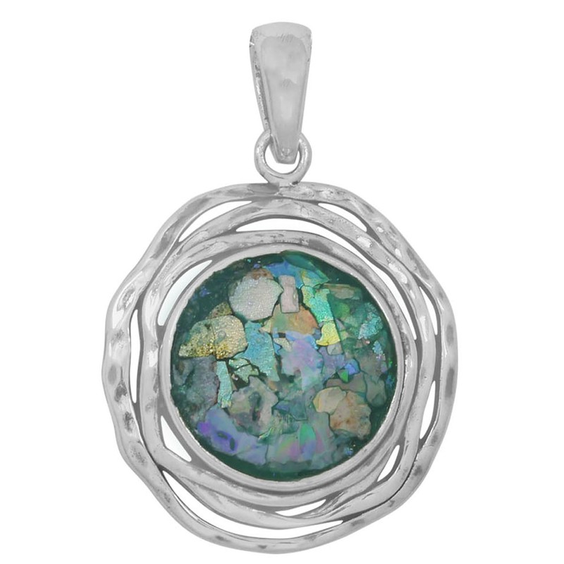 Sterling Silver Round Ancient Roman Glass Pendant Necklace with Textured Triple Frame and 18" Chain
