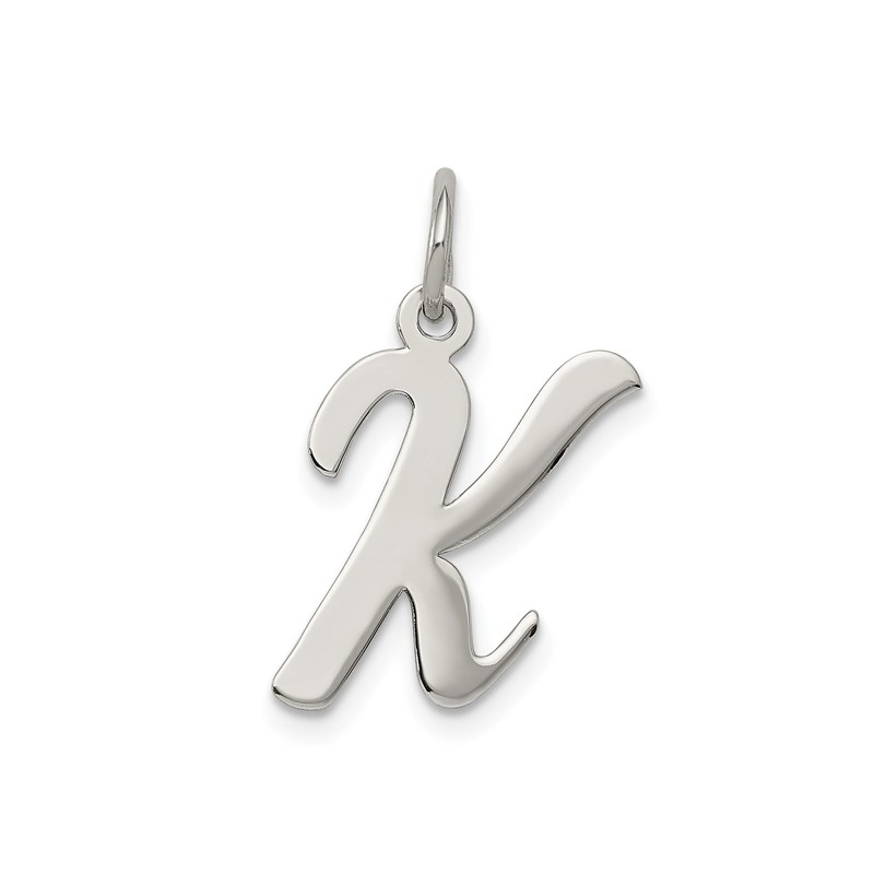 - Designed with graceful lines and a glossy shine this script style name pendant enhances your collection of scripted silver jewelry with its sophisticated cursive K and polished elegance