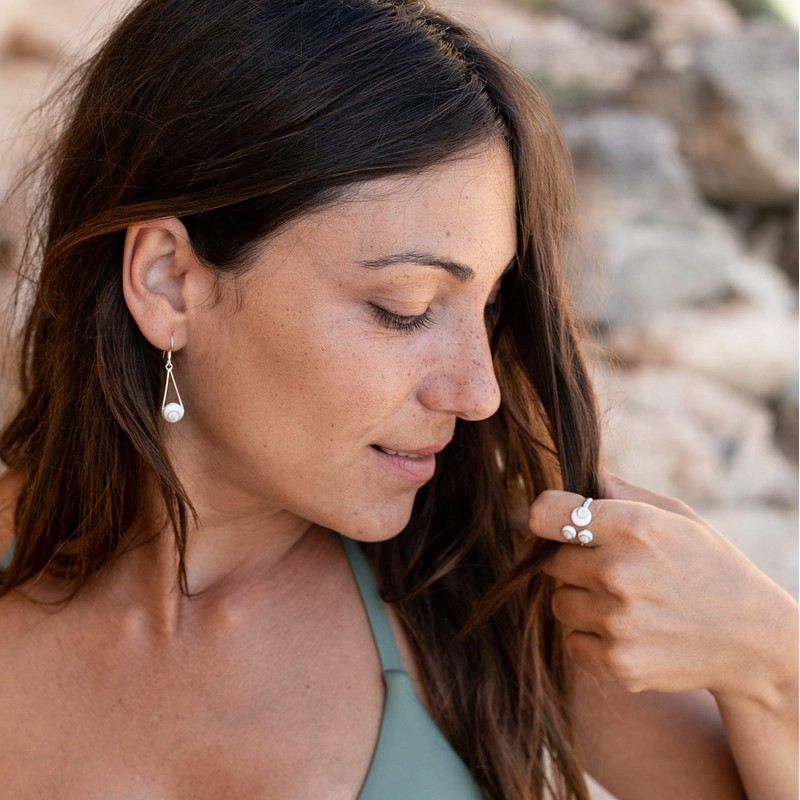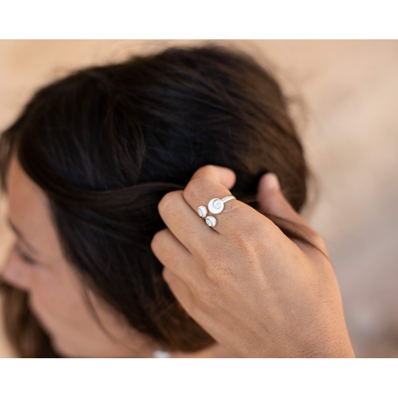 - Ring aus 925 Sterlingsilber (mit Stempel) und Drei Sorgfältig Polierte Natürliche Meeresmuscheln. Steingröße: 6 mm und 8 mm Durchmesser.