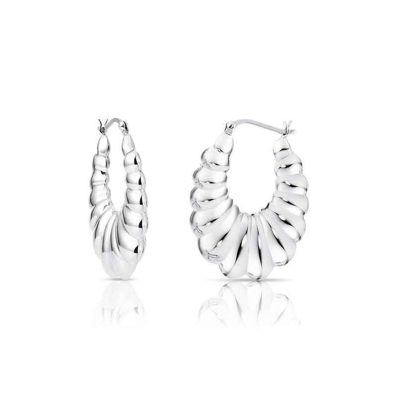 Inspired by the creole hoop earring that first became popular in the Victorian era, these oval hoop earrings add a sophisticated contemporary finish to the classic design. Made by expert craftspeople from sleek .925 sterling silver, these hoop earrings have a sculpted scalloped oval shape. The cool, smooth gleam of the polished silver accentuates the fluid, curved lines of the earring hoop to perfection. These earrings measure 28mm x 35mm and have a hinged latch-back fastening to hold them securely and comfortably in place. Hoop earrings are a flattering, feminine style that are always in fashion and completely versatile. These scalloped creole hoop earrings will appeal to women of all ages, from existing fans of this style to those who are trying hoop earrings for the first time. These earrings look fantastic worn with short or long hair styles, adding a confidently chic touch to both casual and formal apparel. These sterling silver oval hoop earrings are great addition to your jewelry box, or would be a charming birthday, anniversary or Christmas gift for a special woman in your life. Certain to be appreciated for their high quality craftsmanship and deluxe finish, the timeless style of these creole hoop earrings means that they will be worn and enjoyed for seasons to come.