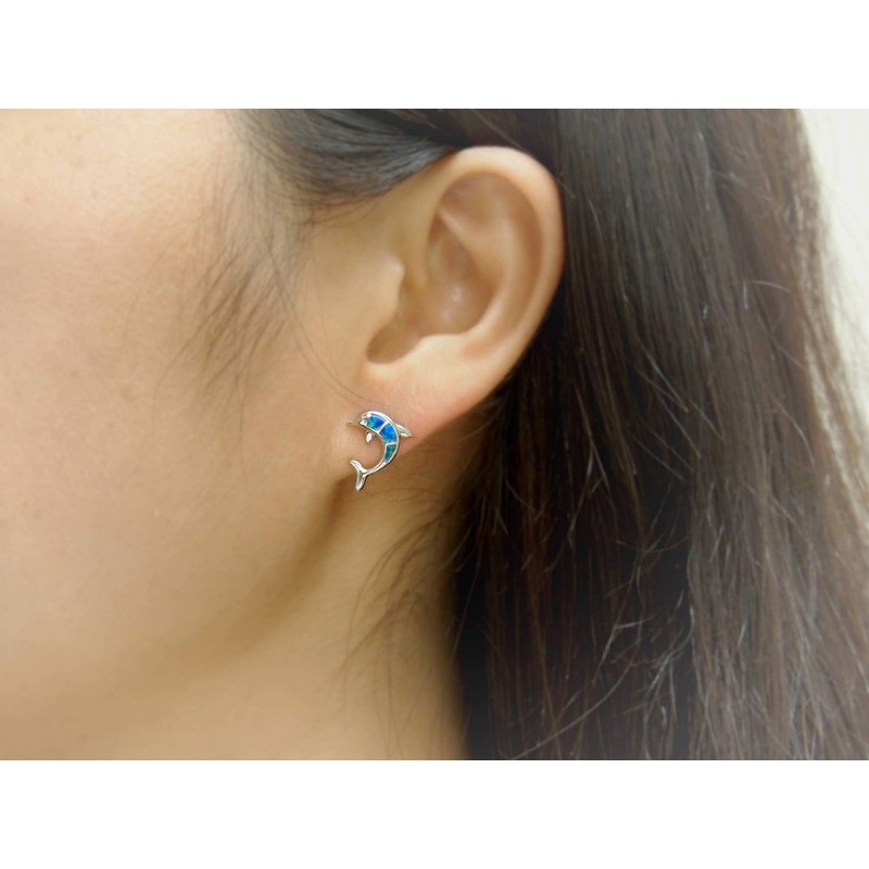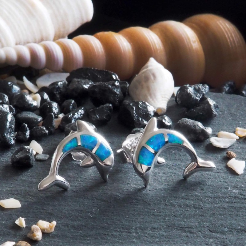 Sterling Silver Synthetic Blue Opal Dolphin Stud Earrings
