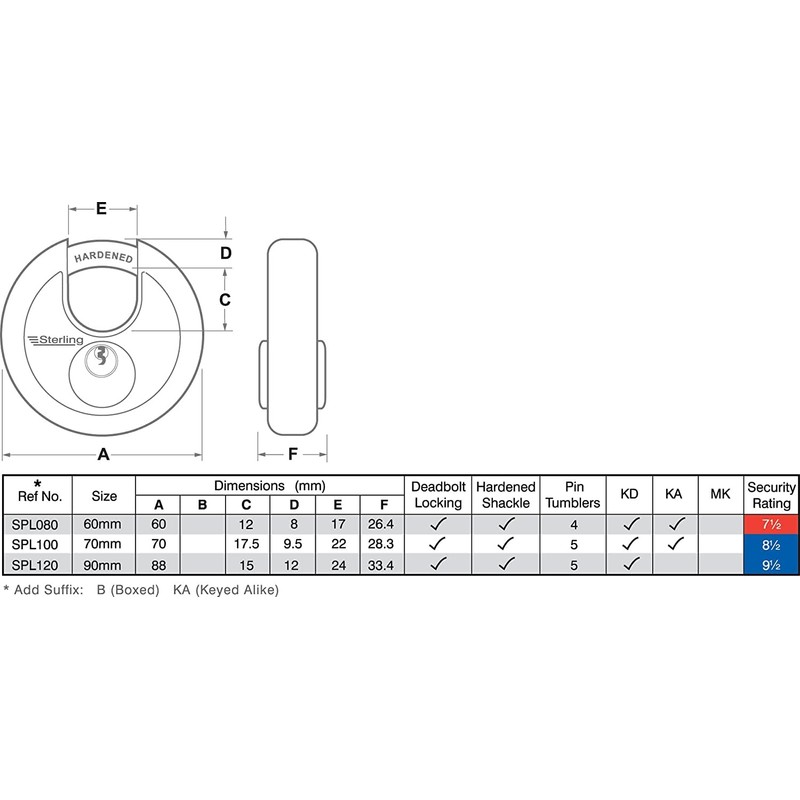Sterling SPL100 70mm Closed Shackle Disc Padlock with Stainless Steel Body , Grey