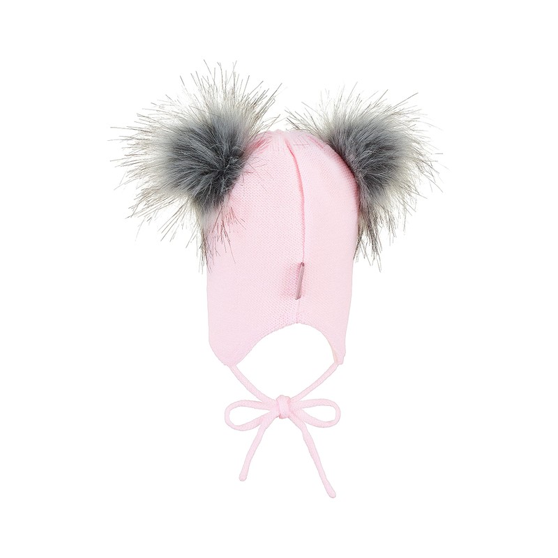 - Knitted hat with faux fur pompoms and ties, lined with napped cotton jersey.