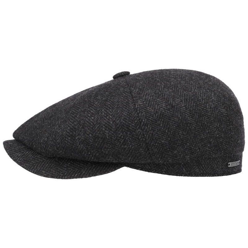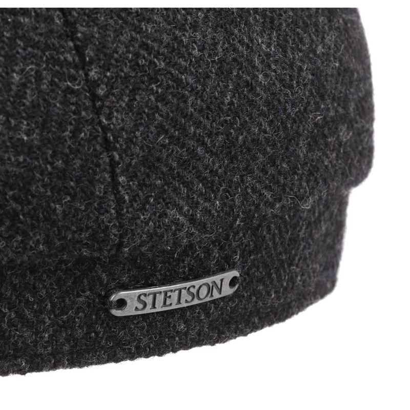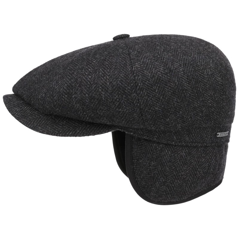 Stetson Hatteras Classic Ear Flaps Flat Cap - Peaked Cap Made of 100% Wool - Herringbone Pattern - Wool Cap with Ear Protection - Made in the EU - Men - Autumn/Winter, black / grey, 57