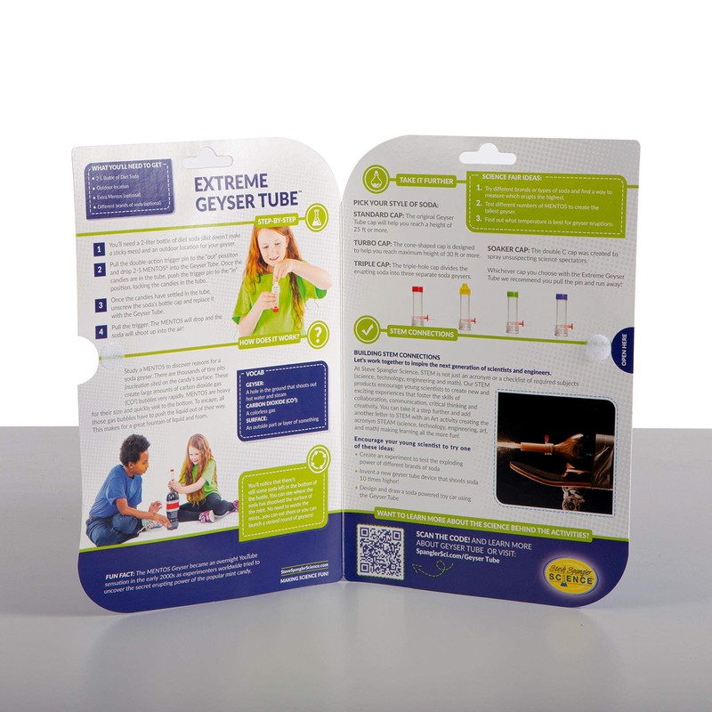 - Grab A Soda Then Prepare For The Show: This Extreme science set has everything you need except the 2-liter soda! It includes a uniquely crafted geyser tube, Mentos candies, and 3 cap variations to experiment with different mesmerizing eruption styles: Turbo cap for runaway flow; Triple cap for fountain flow; and Soaker cap for fan flow. Try them all!