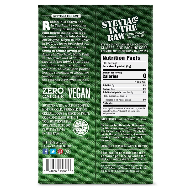 Enjoy sweet moments with Stevia In The Raw Plant-Based Zero Calorie Sweetener Packets, 800 count, 1 pack. This sugar substitute's sweetness is extracted from the leaves of the stevia plant. The delicious sweet flavor comes without any calories and each packet is equal to the sweetness of 2 tsp. of sugar. These packets are single serve so you can conveniently take them on-the-go. They are naturally gluten free, vegan, and low glycemic value. Our stevia packets are perfectly crafted to sweeten hot and cold beverages, or sprinkle on your favorite foods!