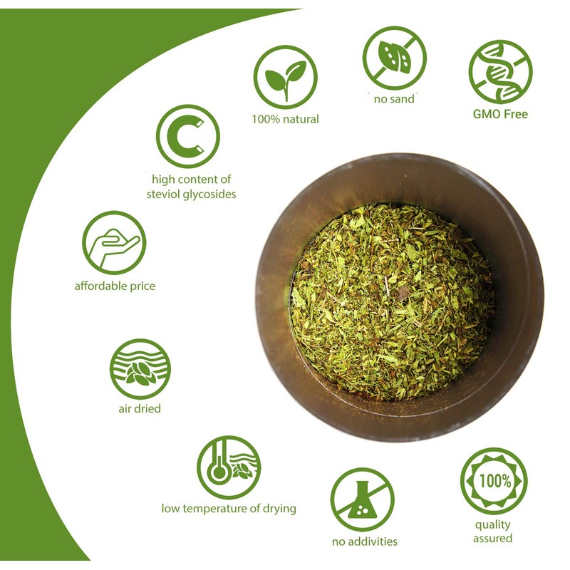 - Geat idea as an addition to tea, herbal and fruit infusions. Steviol glycosides do not increase the level of glucose in the blood, and even cause its lowering by increasing the sensitivity of the body to insulin. Replacing high-energy sugar with low-calorie stevia can help prevent excess weight gain and obesity and can be helpful in weight reduction.