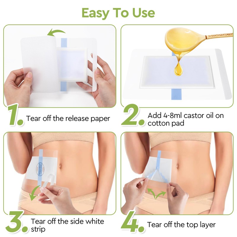 - No Wash & Time Saving:1.Tear off the release paper. 2. Pour a few spoons of organic castor oil onto the cotton fabric. 3. Stick the patch to your liver area or stomach ect. 4. Tear off the top layer and side white sticker. Place hot water bottle or heating pad on top. Tear off after 45-60 minutes. Please noted DO NOT use castor oil pack when you're pregnant