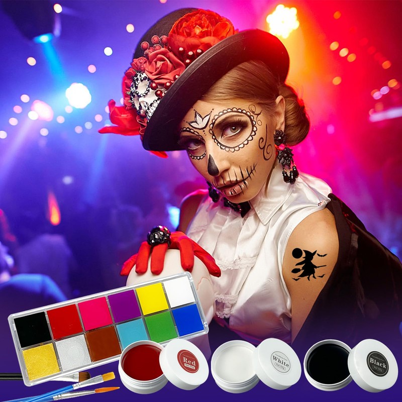 - Halloween make-up set: contains 1 x 12 colours make-up colour tray and 2 x brushes, 3 x coloured face and body colours (50 g white, 50 g black, 50 g red), 3 x make-up brushes, 4 x hollow inkjet printing, create realistic effects with this deluxe make-up set, easy to create creepy make-up in the style of Halloween zombie vampires