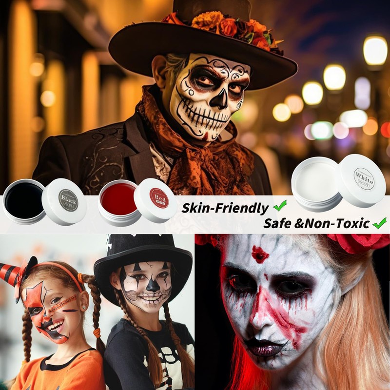 - Halloween Makeup Black White Red :The face paint white, black and red are free from harmful chemicals, safe for children and adults. Enjoy the fun without skin irritation. This face painting set is a high-quality, professional make-up face paint for children or adults with any skin